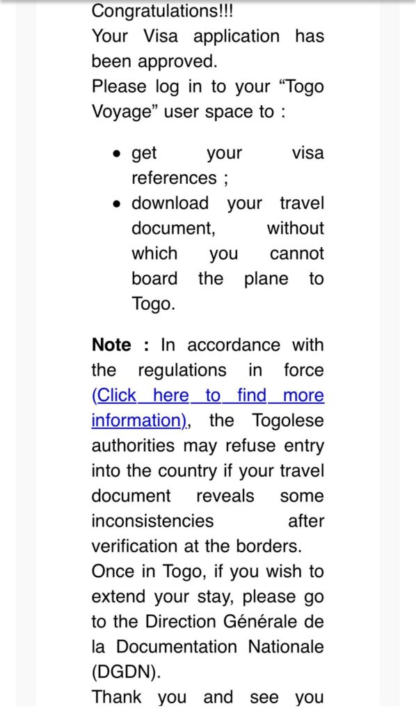 トーゴは、必須書類以外のインビテーションなどは不要みたいで、なくても受かるので安心してください。